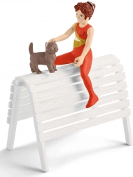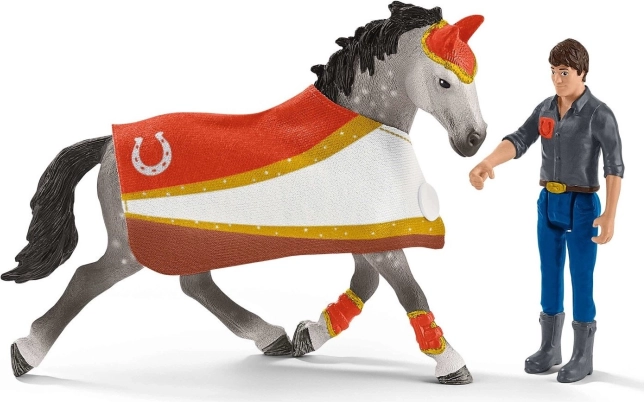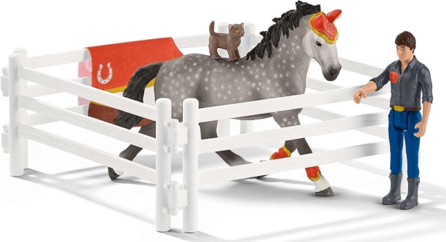 - Mia (bras articulés), entraîneur Tom (membres articulés), cheval de tournoi, chat, selle, bride, 2× martingale, longe, fouet, couverture, support pour couverture (banc), trophée, panier, 4× élément de clôture