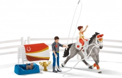 - Équipement complet pour la voltige : cheval, cavalière Mia, entraîneur Tom, enclos, selle, bride, martingales, longe et fouet.