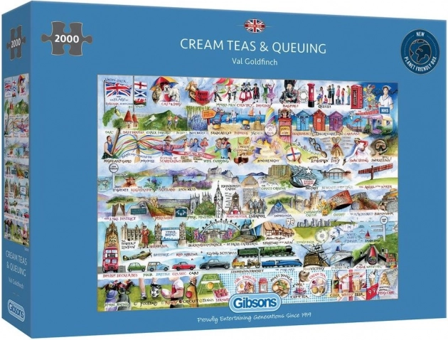 Plongez dans l’atmosphère des salons de thé anglais et profitez d’heures de divertissement avec le puzzle GIBSONS. L’illustration richement détaillée met à l’honneur la tradition du cream tea – scones, crème épaisse, confitures et thé, comme on les connaît dans le Devon et en Cornouailles. Grâce aux 2000 pièces découpées avec précision, vous apprécierez une expérience d’assemblage de haute qualité avec une superbe image finale.