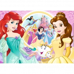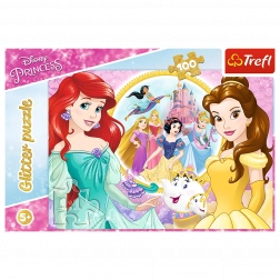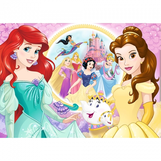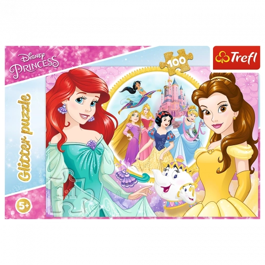 Un puzzle magique pour enfants avec le motif des princesses Disney Belle et Ariel100 pièces et est orné de fines paillettes dorées, qui donnent une brillance unique à l’image et à la boîte. Une fois assemblé, il forme une image de 410 × 278 mm.