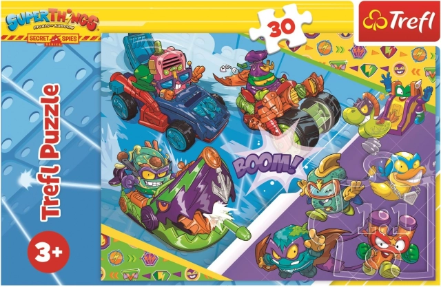 Puzzle pour enfants avec le motif SuperThings : équipe de super espions offrant divertissement et développement des compétences pour les plus petits. Contient 30 pièces, recommandé à partir de 3 ans, une fois assemblé mesure environ 27 × 20 cm – idéal pour les premières constructions ainsi que l’entraînement de la motricité fine et de la concentration.