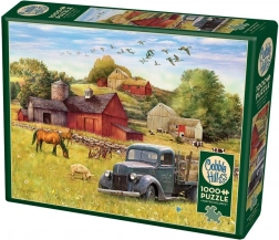 Le puzzle représente une scène de ferme charmante avec une grange rouge, un vieux camion et des animaux paissant dans le pré.