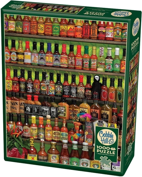 Le puzzle Sauces Pimentées de 1000 pièces de la marque Cobble Hill offre une expérience unique grâce à sa découpe non traditionnelle, différente des grilles standard. Le résultat est une difficulté plus élevée, qui exige patience et minutie lors de l’assemblage.