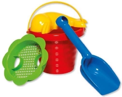 Le set comprend un seau de 11 cm de hauteur, une pelle, un moule et un tamis – l’équipement de base pour construire des châteaux, créer des formes et transporter le sable. Les couleurs peuvent varier, ce qui rend chaque ensemble unique.