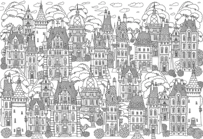 Association unique du montage de puzzle et du coloriage antistress. Une fois le puzzle au motif d’une ville pleine de maisons originales terminé, vous pouvez colorier l’image selon votre imagination.