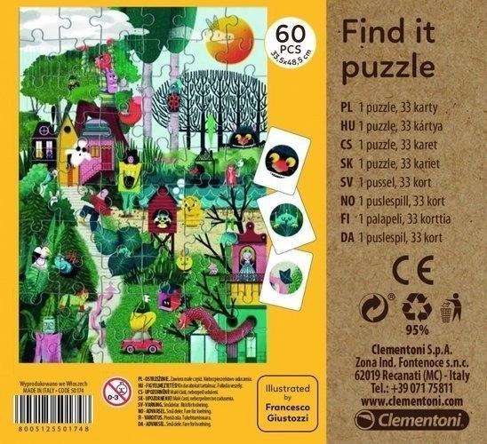 Puzzle au motif féerique d’automne avec 33 cartes, grâce auxquelles le plaisir ne s’arrête pas une fois l’image assemblée. Après avoir complété le motif, cherchez sur l’image les éléments représentés sur les cartes. Parviendrez-vous à tous les trouver ? Un modèle de référence est également inclus dans l’emballage. Les puzzles pour enfants font partie du programme écologique CLEMENTONI Play for Future, créé pour sensibiliser les enfants à l’importance du développement durable et de la protection de l’environnement.