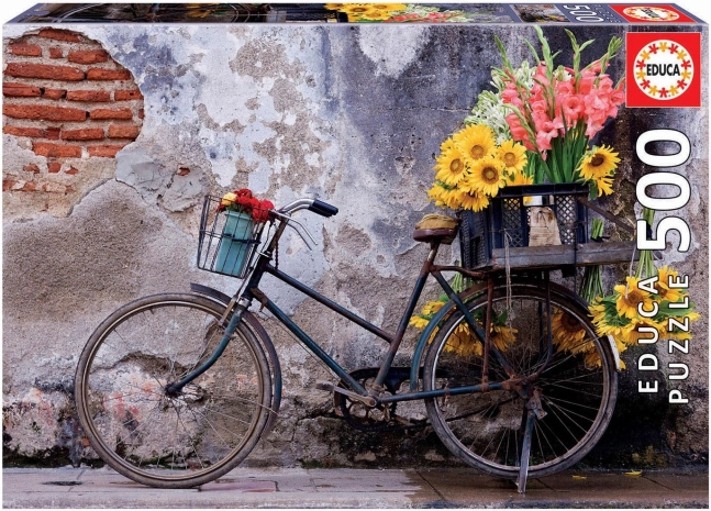 Puzzle Educa Vélo avec des fleurs, 500 pièces. Dimensions 48 × 34 cm, finition de qualité et colle offerte dans la boîte. Détente, divertissement et décoration réunis.