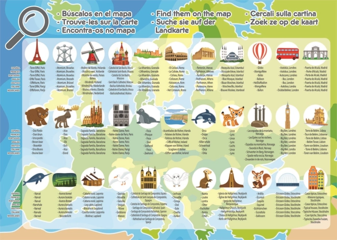 Educa puzzle Carte de l'Europe est un excellent moyen de divertir et d'éduquer les enfants ! Il contient les noms des mers et des océans en anglais ainsi qu'un dépliant informatif avec les noms des animaux et des monuments dans plusieurs langues européennes.