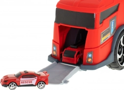 Le camion de pompiers fonctionne comme un transporteur qui acheminera les petites voitures incluses à l’aide d’une rampe.