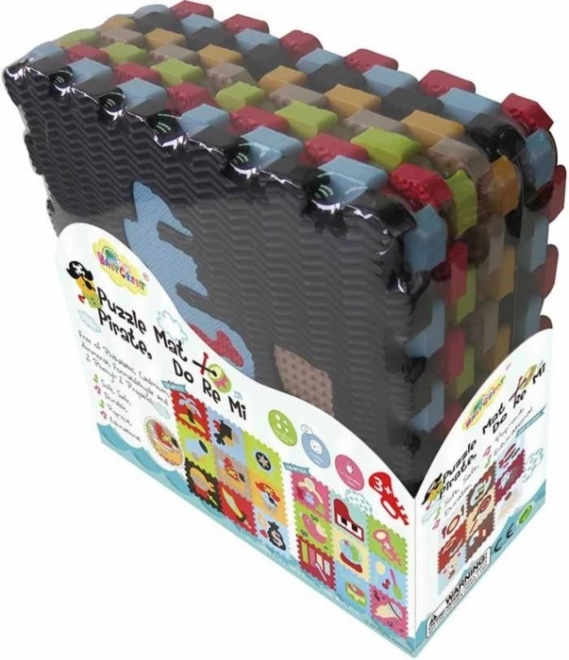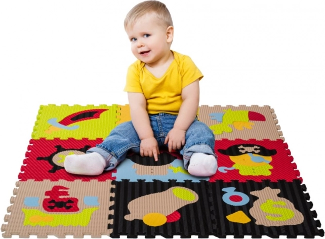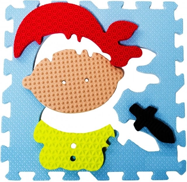 Tapis de jeu en mousse aux couleurs vives avec motifs de pirates offrant une surface douce et sûre pour jouer. Les pièces aux textures variées et aux formes différentes stimulent la perception sensorielle, le d éveloppement de la motricité et la créativité. Le tapis est lavable, absorbe le bruit et isole du froid – idéal pour la chambre d’enfant.