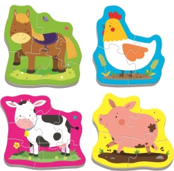 Les puzzles au motif d'animaux de la ferme offrent une activité amusante et éducative pour vos enfants. Ce set comprend 18 pièces permettant d'assembler 4 images différentes d'animaux : un cheval, une vache, un poussin et un cochon. Grâce à eux, les enfants apprennent à reconnaître les animaux et exercent leur capacité à compter.