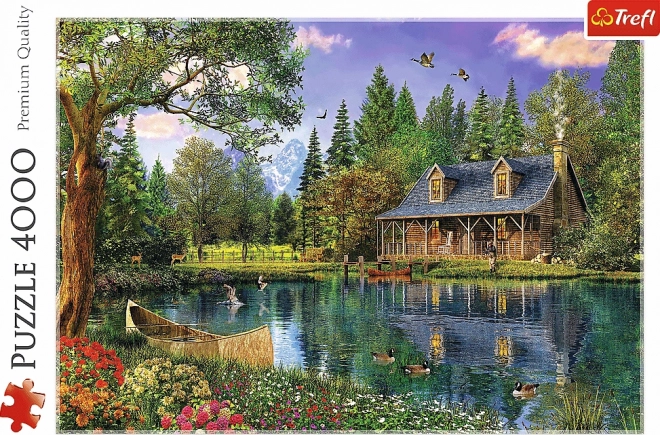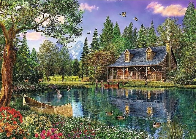 Appréciez l’atmosphère paisible de la nature avec ce puzzle grand format représentant une cabane en bois au bord d’un lac serein, entourée d’arbres et de nature sauvage. Une fois assemblé, le tableau détaillé de 136 × 96 cm est idéal à encadrer pour sublimer votre intérieur.