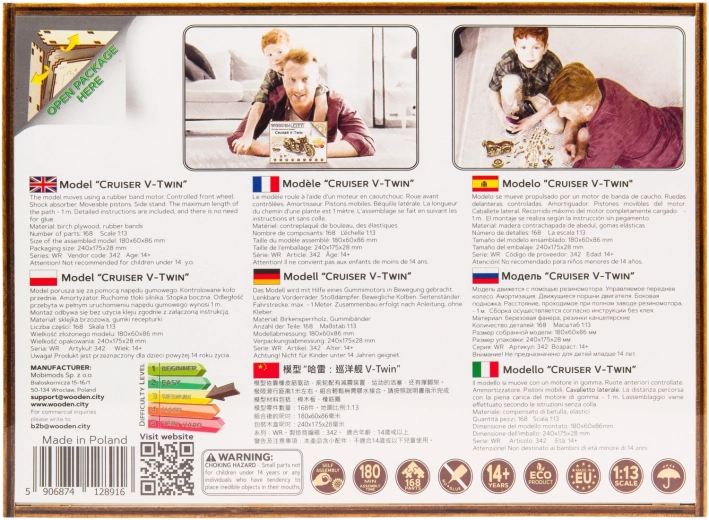 La maquette mécanique en bois de la moto la plus impressionnante, la Cruiser V‑Twin, vous attend ! Grâce au design unique et aux détails surprenants de ce modèle, vous passerez des moments pleins de divertissement et d’émotions. Vous pouvez diriger la moto via la roue avant. Avec son mécanisme à inertie, la moto peut parcourir jusqu’à 1 mètre. Vous serez séduit par les cylindres mobiles lorsque la roue arrière tourne, ainsi que par les amortisseurs sur la fourche avant. Le Cruiser V‑Twin est équipé de disques de frein et de roues caoutchoutées. Dans le modèle se retrouvent des détails d’une véritable moto : - béquille fonctionnelle, - clignotant, - plaque d’immatriculation, - catadioptres, - rétroviseurs. Le puzzle 3D WOODEN CITY Cruiser V‑Twin sera le meilleur cadeau pour tout amateur de motos.