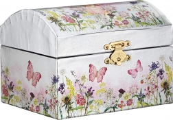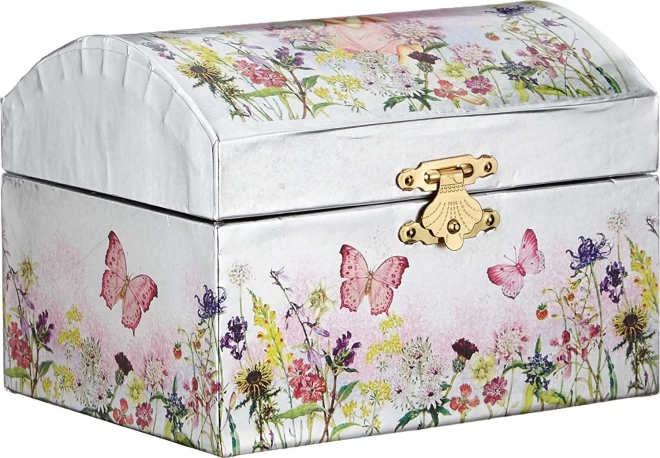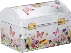 Élégante boîte à bijoux musicale GOKI au design de prairie fleurie ravira toutes les amatrices de bijoux et de petits trésors. À l'ouverture, une ballerine se met à danser devant le miroir et retentit la douce mélodie du Lac des cygnes. Éclat argenté, motifs floraux et papillons et fermeture sûre en font à la fois un bel objet déco et un accessoire pratique.