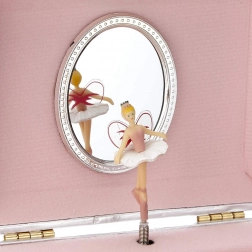 À l'ouverture du couvercle, la ballerine se met à tourner devant le miroir ovale et la douce mélodie du Lac des cygnes résonne – un rituel magique à chaque rangement de bijoux.