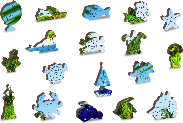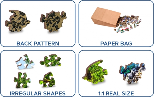 Les pièces aux formes spéciales – incluant des motifs d’animaux et d’objets – présentent des détails accentués au laser, et certaines peuvent se tenir debout comme de petites figurines. Le puzzle est conçu avec des bords lisses sans échardes pour une longue durabilité.