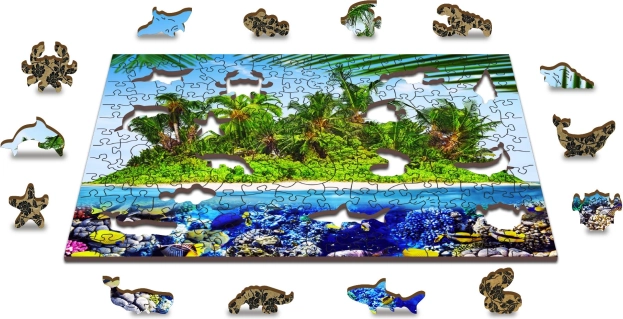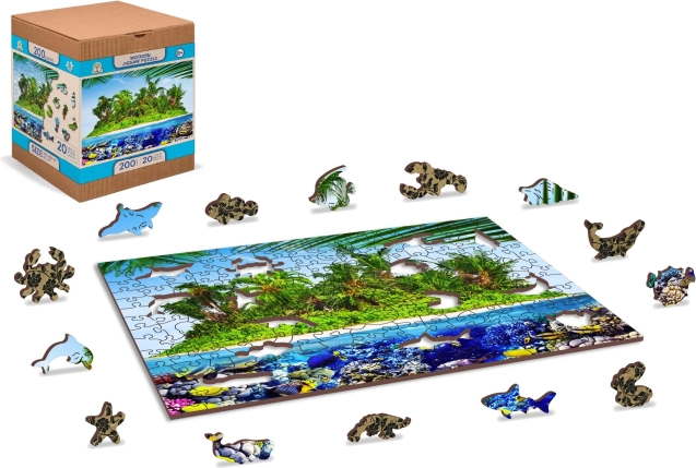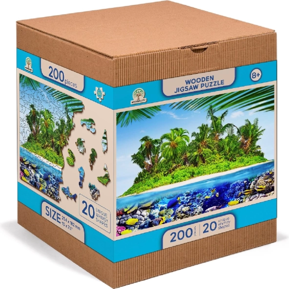 Puzzle en bois réversible 2‑en‑1 – Île exotique, 200 pièces. Formes uniques, détails au laser, difficulté accrue et emballage écologique sans plastique.