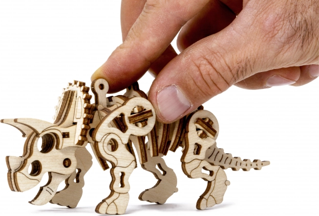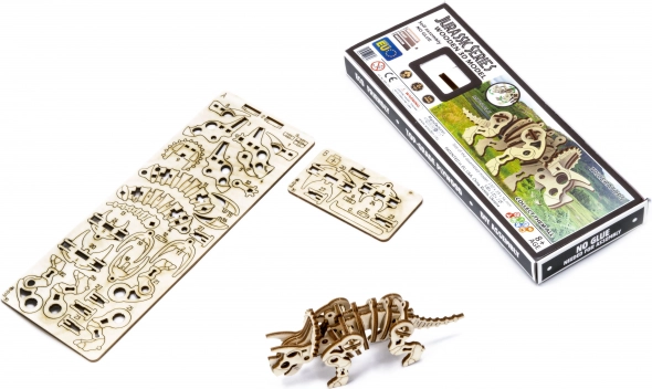 La maquette mécanique en bois de la série Jurassique Tricératops est destinée aux amateurs de créatures préhistoriques. Une fois assemblé, le modèle prend vie entre vos mains, avec une tête et des membres articulés. Grâce au design unique et aux détails surprenants de ce modèle, l’assemblage sera plein de divertissement. Le puzzle 3D WOODEN CITY Jurassic Series Tricératops est un excellent cadeau pour tout passionné de dinosaures. Difficulté : 2 sur 5 (selon la classification Wooden City) Temps d’assemblage indicatif : 1 heure Échelle : 1:70 Les puzzles 3D en bois WOODEN CITY sont des modèles mécaniques fonctionnels finement élaborés, qui s’assemblent sans colle ni outils. Ils sont fabriqués à partir de matériaux en bois écologiques – contreplaqué de bouleau de haute qualité. Avec les puzzles mécaniques en bois WOODEN CITY, vous passerez des heures amusantes à assembler tout en découvrant de près engrenages, moteurs à élastique, roues dentées et autres composants. modèle mécanique fonctionnel assemblage sans colle ni outils fabrication de qualité en matériau naturel détails soignés notice illustrée incluse sur la face intérieure de l’emballage se trouvent des codes QR pour afficher la notice et la vidéo d’instructions AVERTISSEMENT : Pour l’assemblage, un couteau à lame sécable, des ciseaux, du papier abrasif et une bougie de cire sont nécessaires (non inclus). Pour un bon fonctionnement et un usage sans problème, il est nécessaire d’enduire de cire les parties mobiles du modèle. Dimensions du puzzle assemblé : environ 13 x 3,9 x 5,6 cm