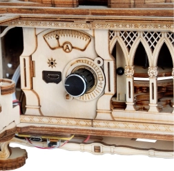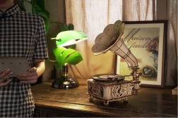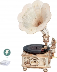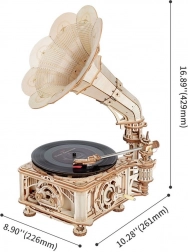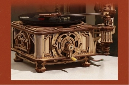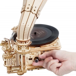 Le paquet comprend un disque vinyle avec trois mélodies : The Merry Gent (0:47), Memory Of A Dance (2:07), et The Giant Killers (1:27). Vous pouvez lire des disques vinyle 7" et 10". Les pièces sont découpées au laser à partir de contreplaqué et l'assemblage suit les instructions fournies.