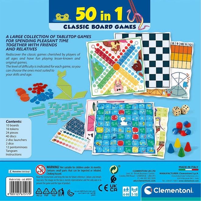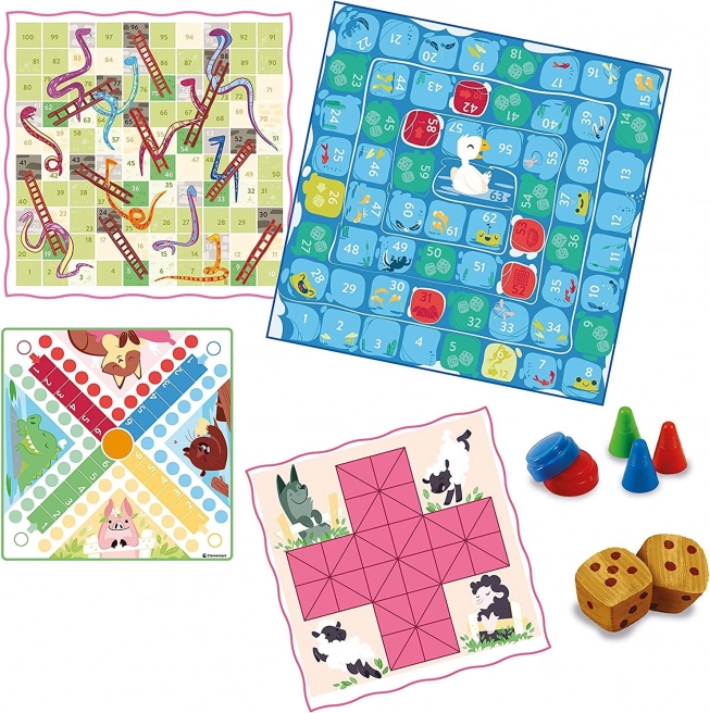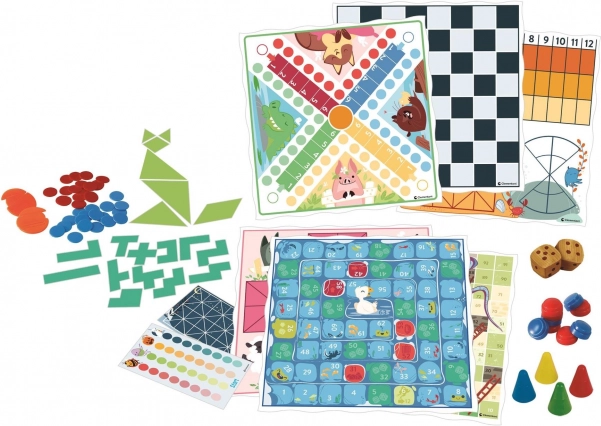 Sur cinq plateaux recto-verso, vous trouverez entre autres Les Petits Chevaux, Dames, Jeu de l’Oie, Serpents et Échelles, Piste de puces sauteuses, Moutons et loups, La Ligne, Adugo, Piste de course, Cascade de puces, Bagh Chal, Lau Kati Kata, ainsi que des casse-têtes logiques Pentamino et Tangram. Grâce aux différents niveaux de difficulté, c’est parfait pour les enfants comme pour les adultes.