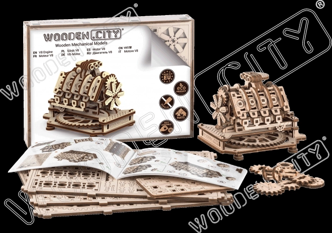 Le puzzle 3D en bois du moteur V8 est un modèle mécanique fonctionnel inspiré des moteurs utilisés même en Formule 1. La conception ouverte permet d’observer le mouvement rythmé des pistons et le fonctionnement de tout le mécanisme. L’assemblage est réfléchi, ludique et instructif à la fois — vous comprendrez les principes des engrenages, des transmissions et des liaisons mécaniques.