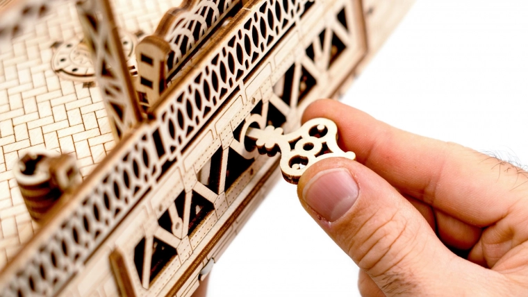 Découpes précises, engrenages et mouvement fluide après cirage. L’assemblage est propre – les pièces s’emboîtent exactement sans nécessiter de colle.