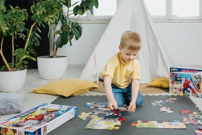 Le puzzle Super Maxi avec 24 grandes pièces ravira tous les jeunes fans de super‑héros. Les enfants assemblent une scène d’action avec l’équipe des AVENGERS, puis retournent les pièces pour profiter de l’autre face – un coloriage et de simples parcours de traçage pour entraîner la main.