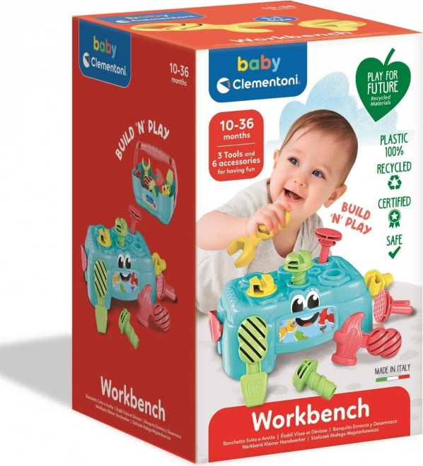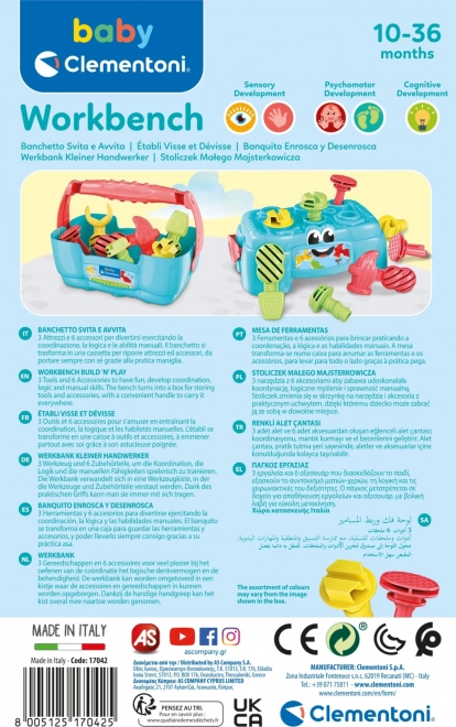 Le petit établi CLEMENTONI BABY Play for Future est un jouet idéal pour les enfants curieux qui aiment visser, marteler et découvrir l’univers des outils. L’établi se transforme en un clin d’œil en une caisse pratique avec poignée, ce qui permet de ranger facilement toutes les pièces et de les emporter partout.
