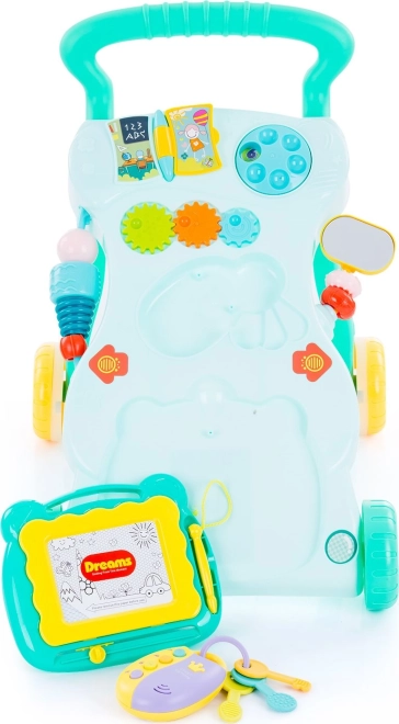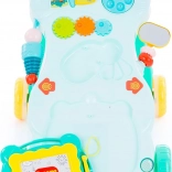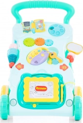 Les accessoires amovibles, tels que les clés avec télécommande et la tablette à dessin, peuvent également être utilisés séparément. Le trotteur est léger, confortable et facile à manœuvrer. Les roues arrière avec semelles antidérapantes en silicone et la possibilité de régler la vitesse de déplacement à l’aide d’un tournevis augmentent la sécurité et le confort.