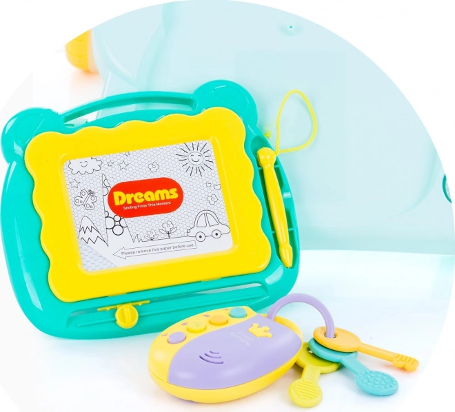 - lumières, mélodies et sons ; tablette à dessin avec stylet ; miroir ; engrenages ; clés amovibles avec télécommande