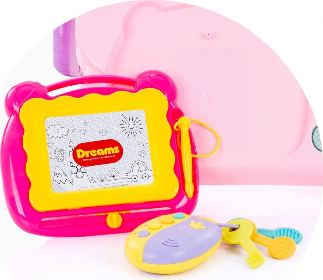 Tablette à dessin avec stylet, engrenages, boutons, petit miroir et clés avec télécommande développent la motricité fine, la vue et l’ouïe.