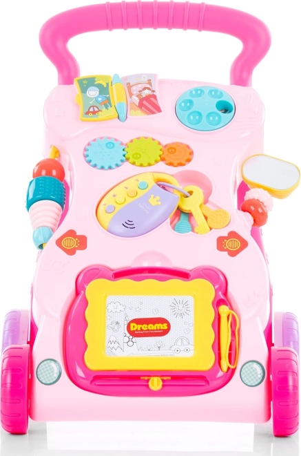 Inclus : tablette à dessin avec stylet, petit miroir, engrenages colorés, boutons et clés avec « télécommande intelligente ». Les jouets amovibles peuvent être utilisés séparément, prolongeant le jeu et favorisant la créativité. Le trotteur diffuse lumières, mélodies et sons, stimulant l’ouïe, la vue et la concentration. Livré dans une boîte cadeau – une excellente idée de cadeau.