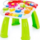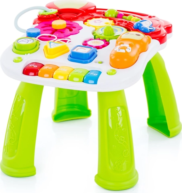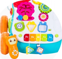 La table propose des boutons, des engrenages et un mini clavier avec notes, qui favorisent la motricité fine, la coordination œil-main et le sens du rythme.