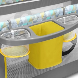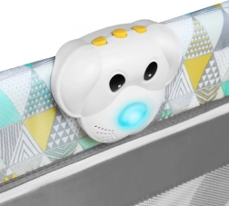 Les accessoires complets comprennent une table à langer, un insert suspendu pour nouveau-né (2 niveaux de hauteur), un panneau latéral avec 3 poches et une moustiquaire. L’entrée latérale zippée avec verrou de sécurité permet aux enfants plus âgés d’entrer et sortir seuls. Les mélodies et le chien interactif divertissent l’enfant, tandis que les roulettes avec frein facilitent les déplacements à l’intérieur et en voyage.