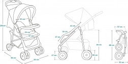 - Confort de l’enfant : dossier à inclinaison continue jusqu’à la position allongée, repose-pieds réglable, assise moelleuse, capote extensible.