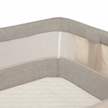 La hauteur réglable sur 5 niveaux permet un alignement précis avec le lit, et la possibilité d’incliner le matelas améliore le confort en cas de rhume ou de reflux. La maille respirante favorise la ventilation et la visibilité sur l’enfant. La structure stable a été testée par TÜV SÜD et SGS selon les normes EN 1130 et EN 16890.