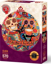 - Pack complet : puzzle rond de 570 pièces, panneau de fond, mécanisme d’horloge avec accessoires, 4 éléments de cadre et 8 agrafes de liaison.