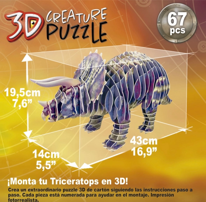 Découvrez un modèle 3D unique de tricératops que vous assemblerez facilement grâce aux pièces numérotées et à une notice illustrée claire. Les pièces se détachent aisément du carton et s’emboîtent avec précision – aucune colle ni ciseaux nécessaires.