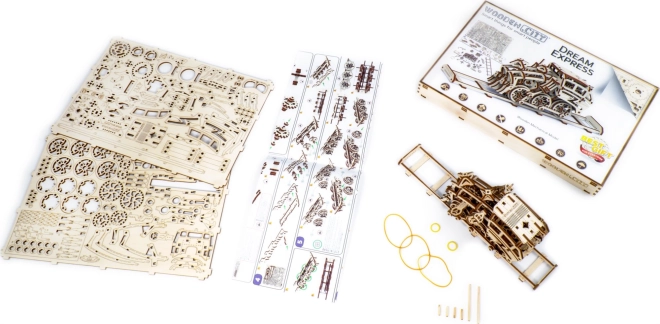 Le modèle Express des Rêves est équipé de roues motrices et permet un mouvement en avant, en arrière et en cercle. Il peut parcourir jusqu’à 3 mètres lorsque le moteur à élastique est entièrement armé. C’est un excellent moyen pour les enfants comme pour les adultes de se familiariser avec les principes de la mécanique et l’habileté manuelle lors de l’assemblage. L’emballage comprend un manuel illustré qui facilite le montage.