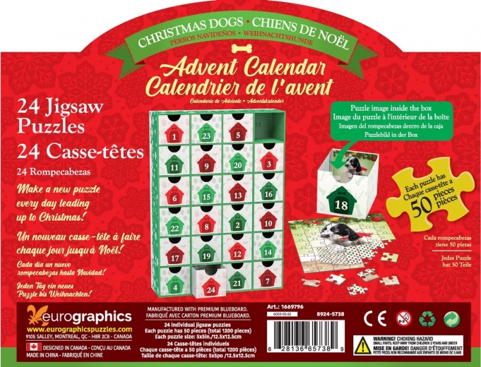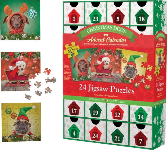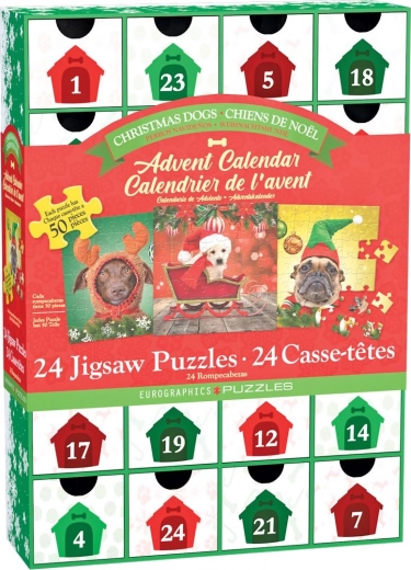 Faites passer l’attente du réveillon plus vite avec l’original calendrier de l’Avent EUROGRAPHICS qui cache 24 mini puzzles sur le thème des chiens de Noël. Chaque jour, assemblez un puzzle de 50 pièces au format 12,5 × 12,5 cm. La boîte rigide avec 24 tiroirs est réutilisable – l’année prochaine, vous pourrez facilement la remplir de petites surprises.