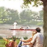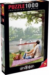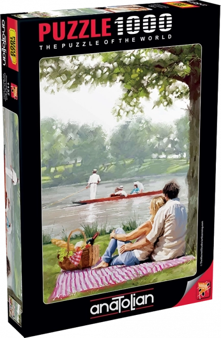 Puzzle Pique-nique au bord de la rivière offre un divertissement unique avec 1000 pièces et un support pratique utilisant le couvercle de la boîte comme modèle pendant l’assemblage.
