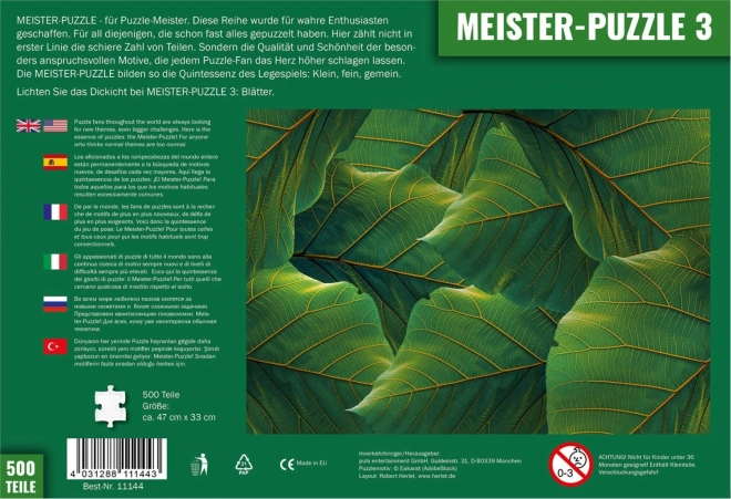 Profitez d’un assemblage exigeant avec le troisième motif de la série Meister-Puzzle – feuilles. 500 pièces et un format compact de 47 × 33 cm raviront tous ceux qui recherchent un véritable défi et souhaitent élever leurs compétences au niveau supérieur.