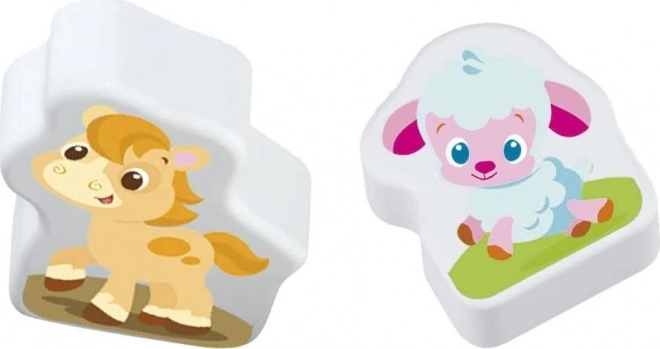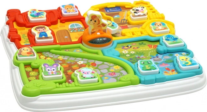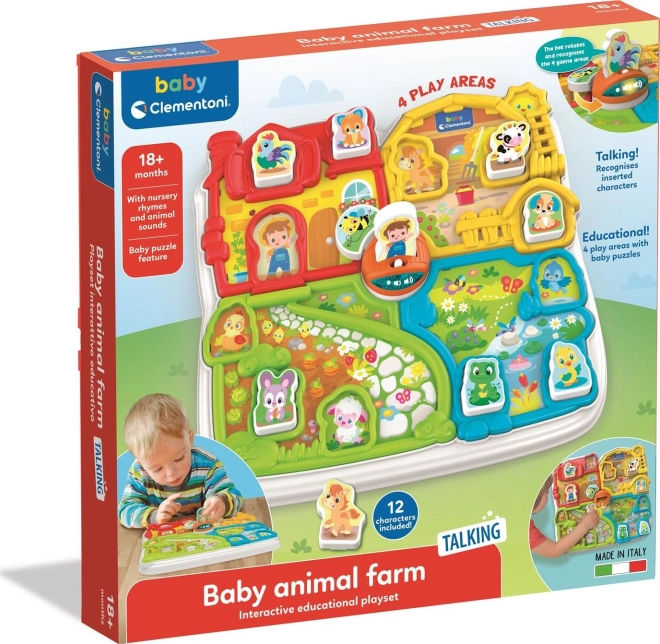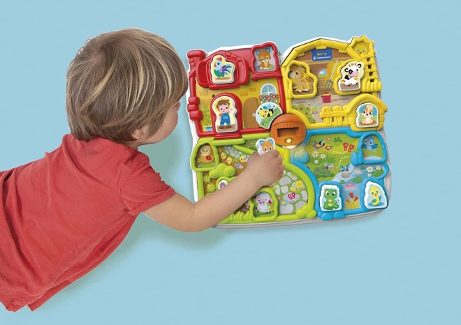 La ferme interactive propose quatre zones distinctes par la couleur – ferme, étable, jardin et étang. Elle inclut également un puzzle avec 12 pièces que les enfants peuvent utiliser comme figurines pour d'autres jeux. Une abeille rotative autour du pont assure un autre élément amusant.