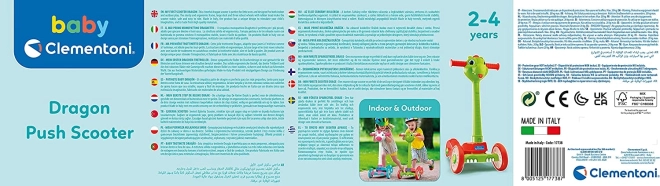 Adorable trottinette pour enfants en forme de petit dragon de CLEMENTONI BABY, idéale pour les premières virées des petits pilotes. Elle dispose d’un cadre robuste, de trois roues en caoutchouc pour plus de stabilité et de poignées souples en caoutchouc. Parfaite à la maison comme à l’extérieur, elle aide à développer l’équilibre, la coordination et les compétences motrices.