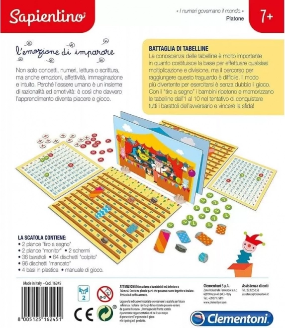 Bataille des Multiplications de Clementoni est un jeu de société amusant qui améliore les multiplications des enfants de manière ludique, rappelant des jeux classiques comme les navires ou la bataille navale.