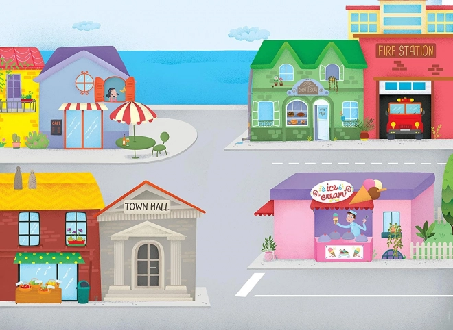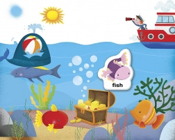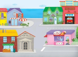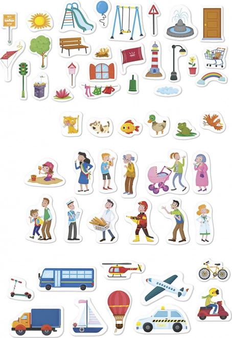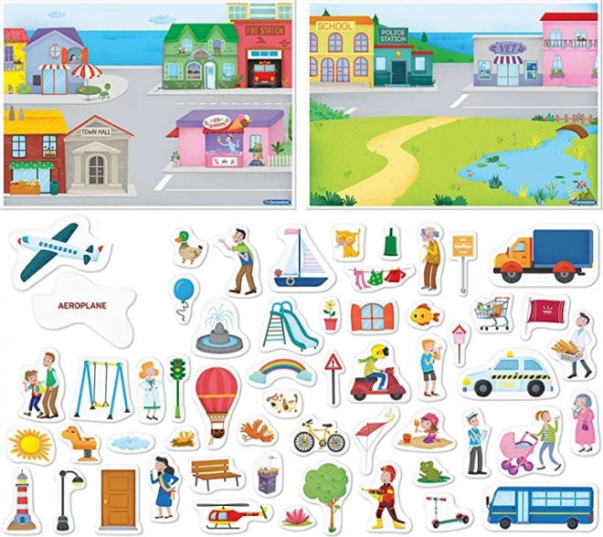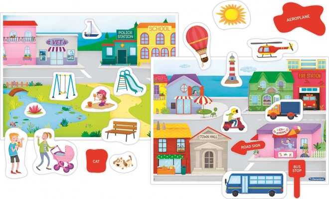 Deux scènes richement illustrées encouragent la narration et l’entraînement du vocabulaire sur les lieux, les professions, les transports et les animaux.