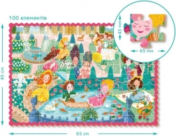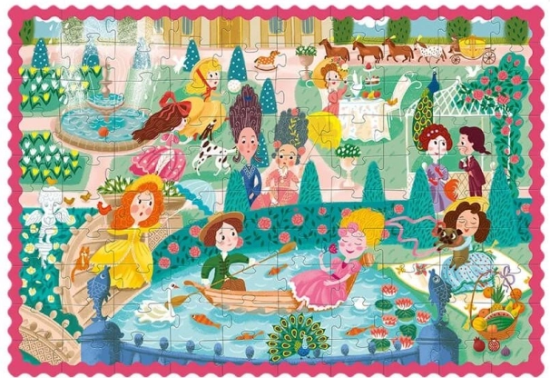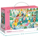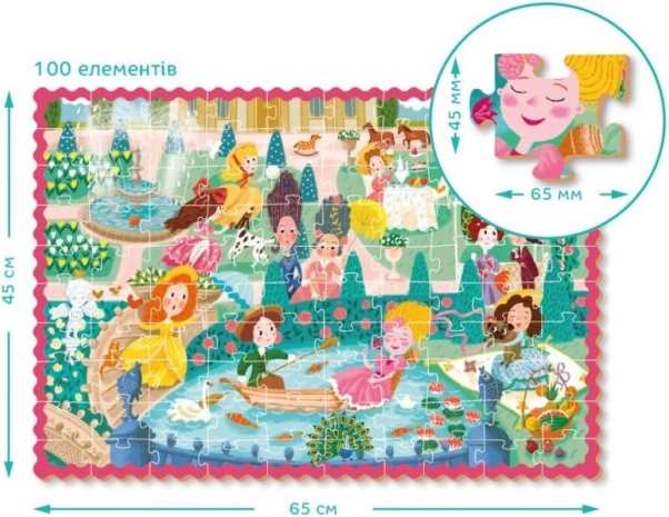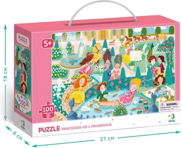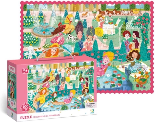 Puzzle joyeux pour enfants, idéal pour les petits amoureux des contes : 100 pièces sur le thème des princesses en promenade, au format 65 × 45 cm. Idéal dès 5 ans, il favorise le raisonnement logique, la patience et la motricité fine. Boîte pratique avec anse pour un transport facile, parfaite à la maison comme en voyage.
