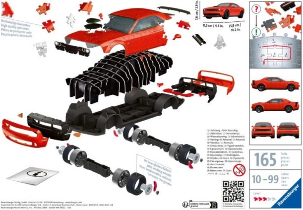 Découvrez une combinaison unique d’assemblage et de construction en créant un modèle impressionnant de la Dodge Challenger R/T Scat Pack Widebody dans sa couleur rouge iconique, composé de 108 pièces. Puzzle en plastique de haute qualité avec technologie Easyclick. Aucun collage nécessaire ! Avec roues fonctionnelles et pivotantes.