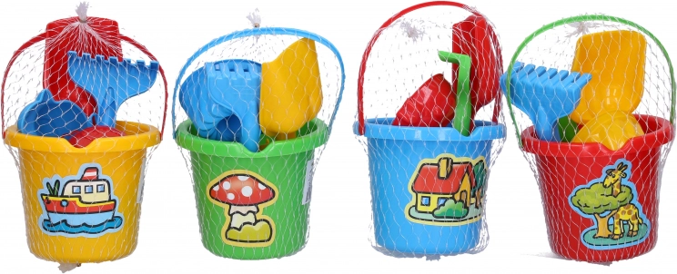 Pratique set de sable pour enfants avec un petit seau de 10 × 11 cm, idéal pour l’aire de jeux et la plage. Contient un seau, un râteau, une pelle et 3 moules (poisson, gâteau de sable, caneton). Disponible en 4 variantes de couleurs – bleu, rouge, jaune et vert.