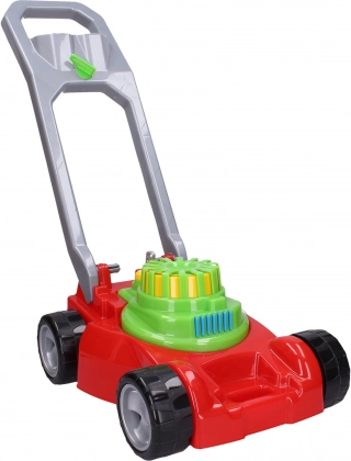 Tondeuse à gazon. Tondeuse assemblée 68(L) x 28(l) x 55(h) cm, poignée comprise. Les roues avant sont libres, les roues arrière cliquettent en roulant. Tondeuse sans poignée 37x28x19 cm. La poignée comporte un interrupteur rotatif à déclic. Au centre de la tondeuse se trouve une spirale colorée rotative, qui se met à tourner en tirant ou en repoussant le levier.